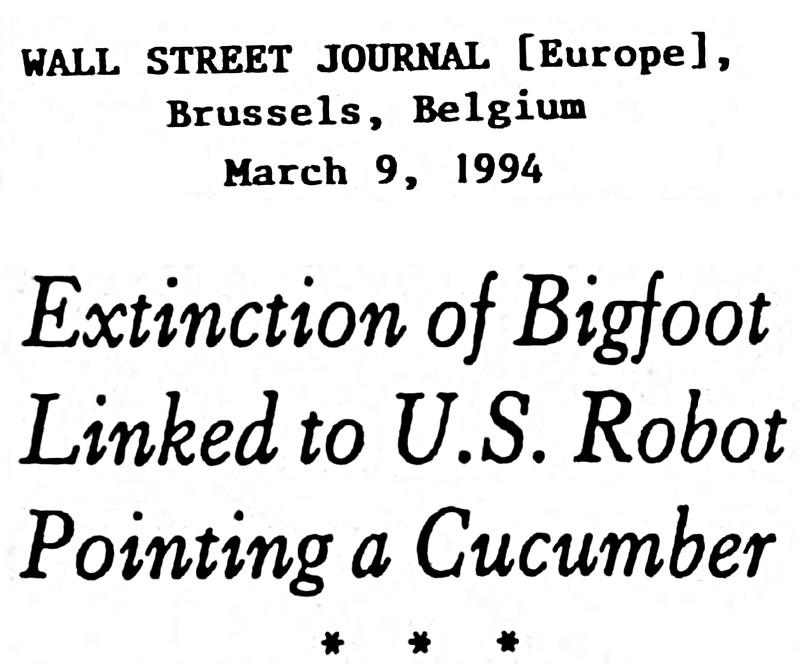 "Extinction of Bigfoot linked to U.S. robot pointing a cucumber."  From UFO Newsclipping Service, 1994.