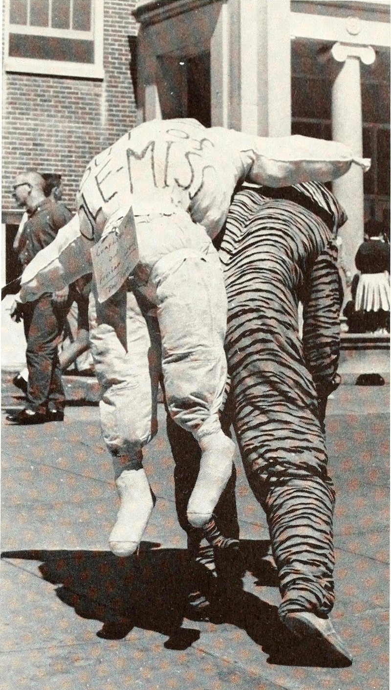 We weren't sure what exactly the mascot was eating, until we saw a separate photo of the mascot carrying away an effigy of its rival Ole Miss.  By the way, it's a terrible thing to photograph a mascot (or one of its close relatives, theme park characters) with its head removed.  We've sent a message back through time, cautioning the photographer against violating mascot etiquette.  (What's the point?  You know nothing will convince him not to use these photos.)  From Memphis State's 1963 yearbook.