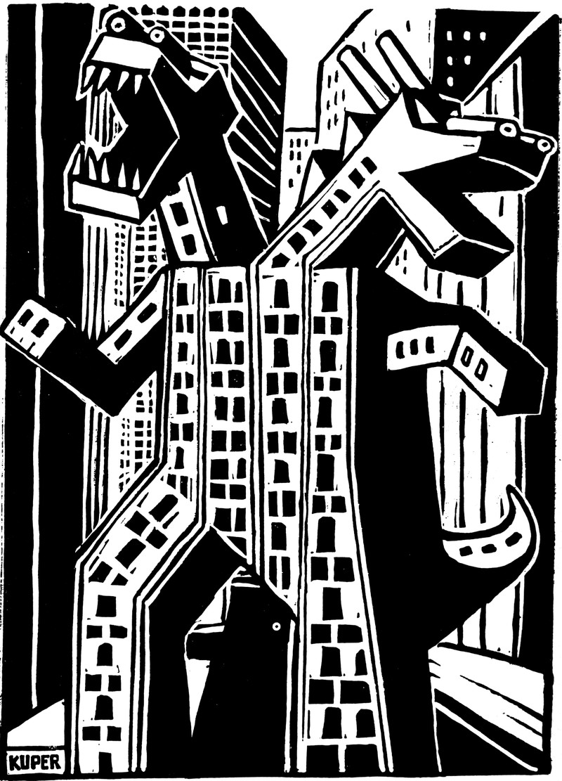 #vintage illustration #monster #two headed #skyscraper #1980s
