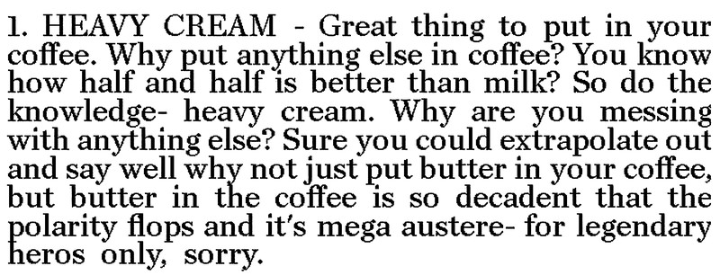 Here's the real (surprising) reason why heavy cream should go in coffee but liquid butter shouldn't. From a great Top Ten list with only eight items, in Monsters News, 2012.
