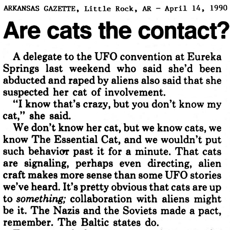 On the likelihood of cats signalling and directing alien craft.  Via UFO Newsclipping Service, 1990.
