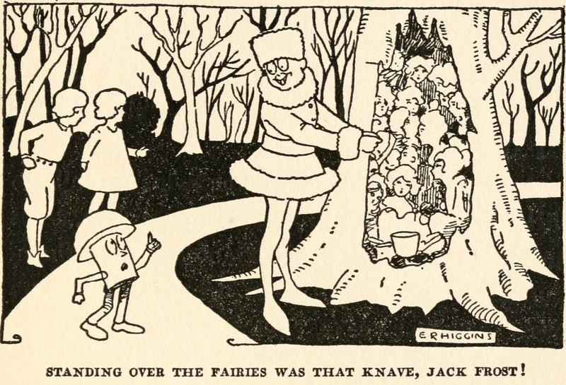 Jack Frost freezing fairies into a hollow tree.  From The Adventures of Nancy and Nick in Scrub-Up-Land by Olive Roberts Barton and illustrated by E. R. Higgins, 1921.