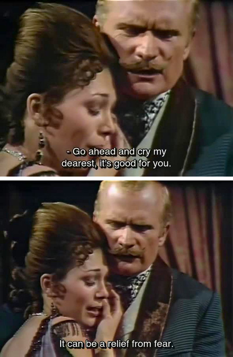 Here's a precursor to the band name Tears for Fears. "Go ahead and cry my dearest, it's good for you. It can be a relief from fear." From Dark Shadows episode 852.