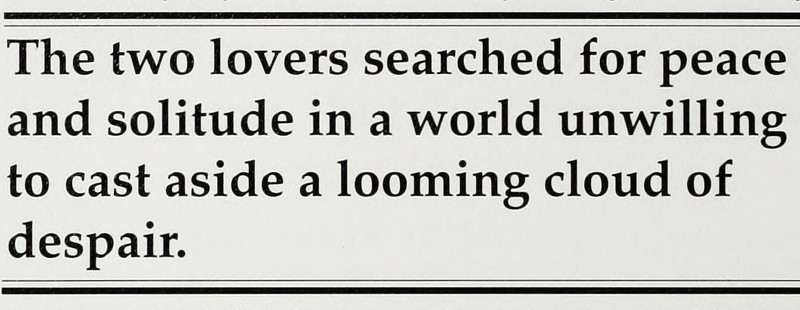 "The two lovers searched for peace and solitude in a world unwilling to cast aside a looming cloud of despair."  From Santa Clara's 1994 yearbook.