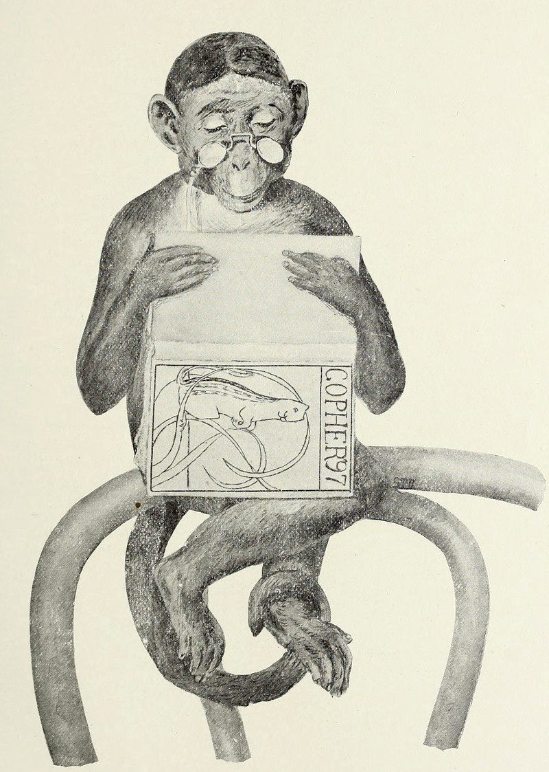 A monkey looking at a gopher centerfold.  From the University of Minnesota's 1896 yearbook.
