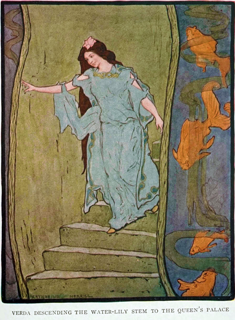 Descending a water-lily stem to the queen's palace."  From Edda and the Oak by Elia Wilkinson Peattie and illustrated by Katherine Merrill, 1911.