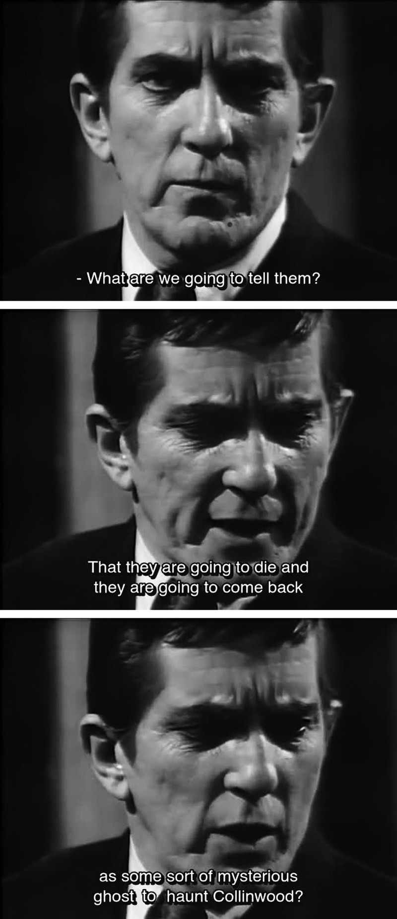 "What are we going to tell them? That they are going to die and they are going to come back as some sort of mysterious ghost to haunt Collinwood?" From Dark Shadows episode 1075.