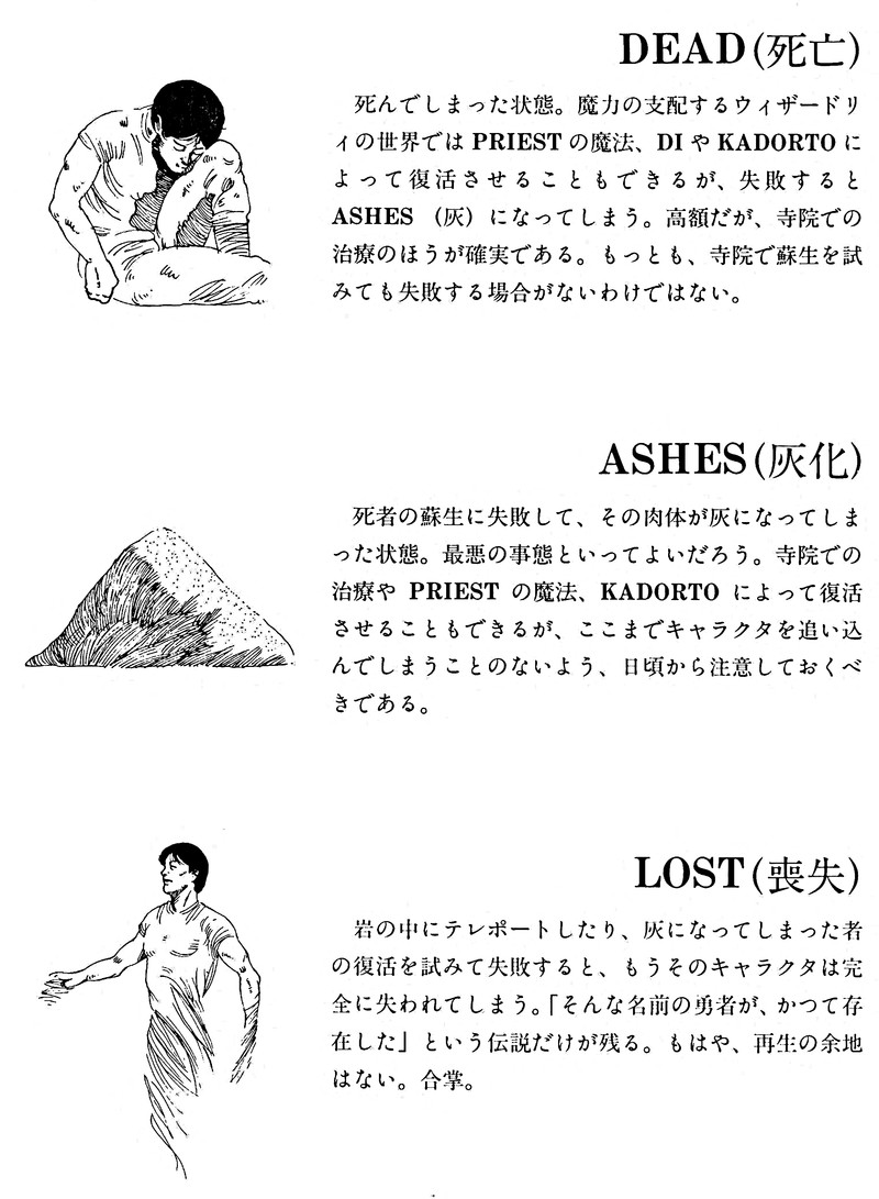 We double-checked, and these are indeed the nine states of existence: 1. OK, 2. afraid, 3. asleep, 4. paralyzed, 5. petrified, 6. poisoned, 7. dead, 8. ashes, 9. lost [as a ghost wandering the otherworld]. From Wizardry Handbook.