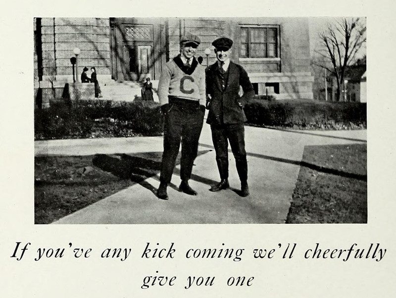 "If you've any kick coming we'll cheerfully give you one."  From Cornell College's 1920 yearbook.