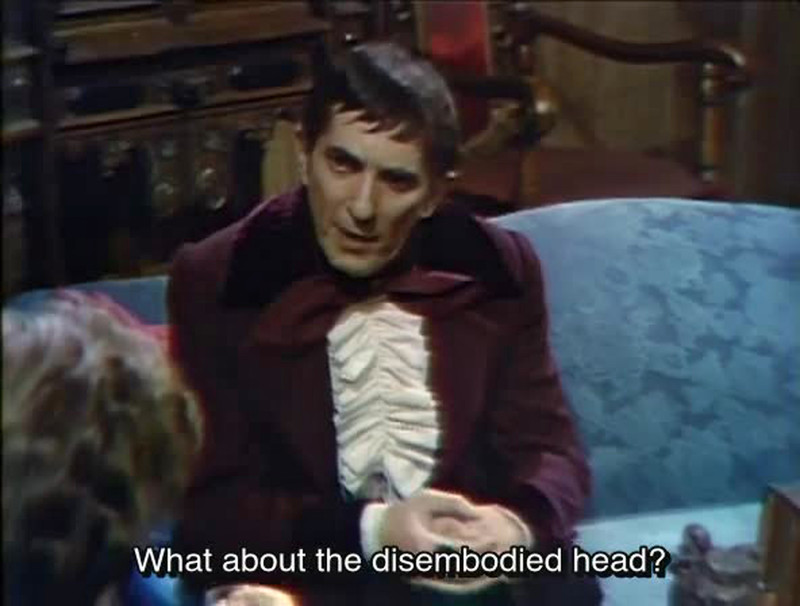 That moment when someone's anecdote begins straying from the sensationalism: "What about the disembodied head?"  From Dark Shadows episode 1129.