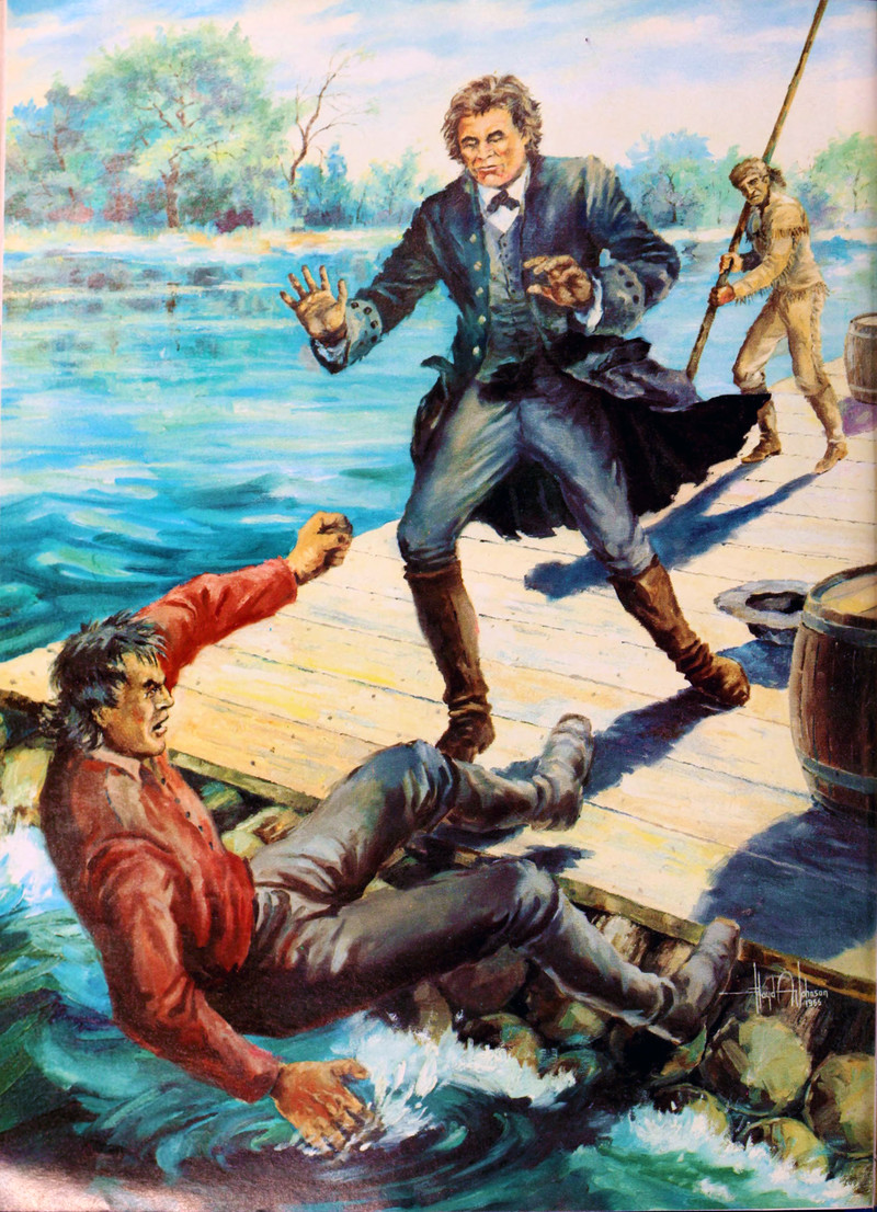#vintage illustration #falling #raft #all wet #pushed #men fighting