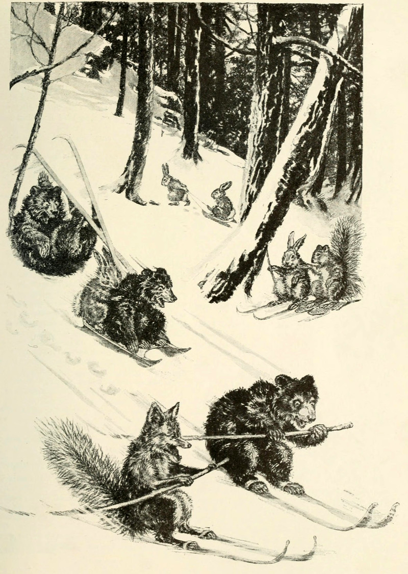 #vintage illustration #anthropomorphism #animals #snow #winter #bear #skiing