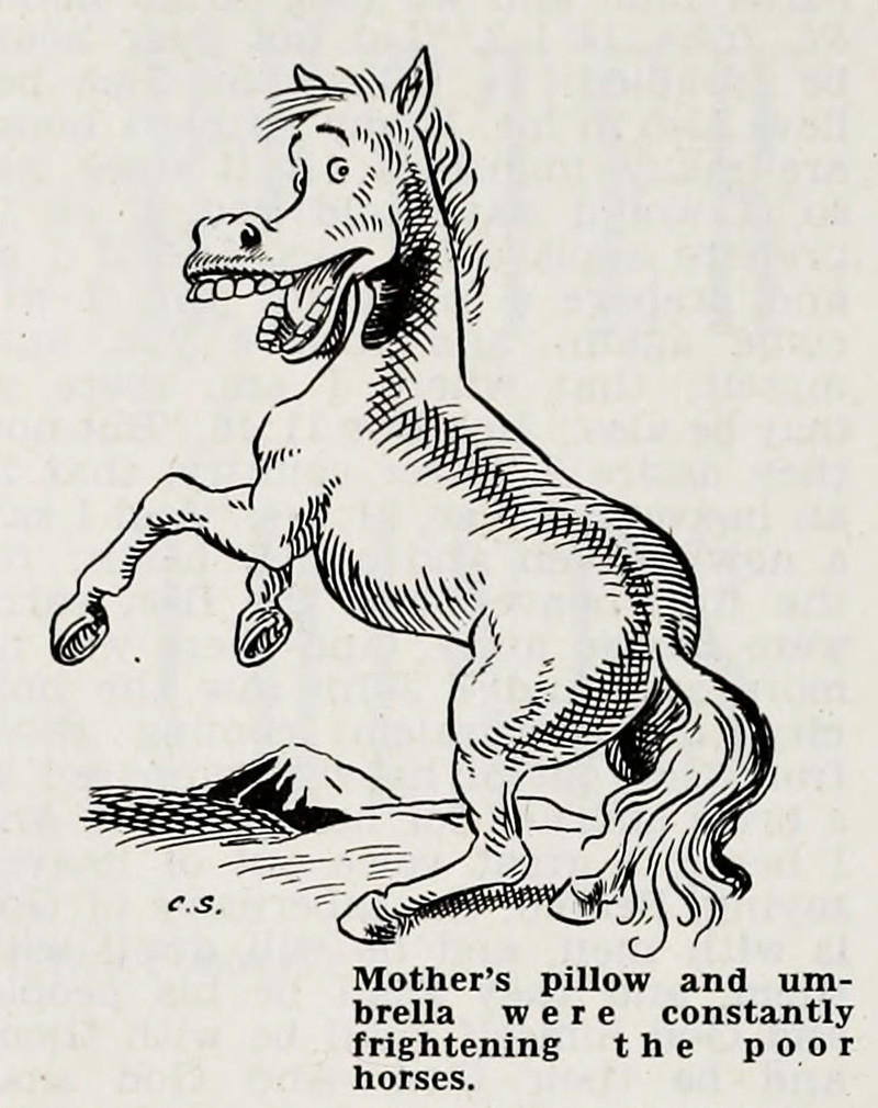"Mother's pillow and umbrella were constantly frightening the poor horses."  From Lighted Pathway, 1952.