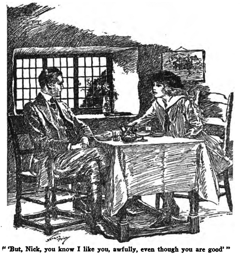 Even though he is good, she likes him awfully.  From The Crystal Heart by Phyllis Bottome and illustrated by Norman Price, 1921.