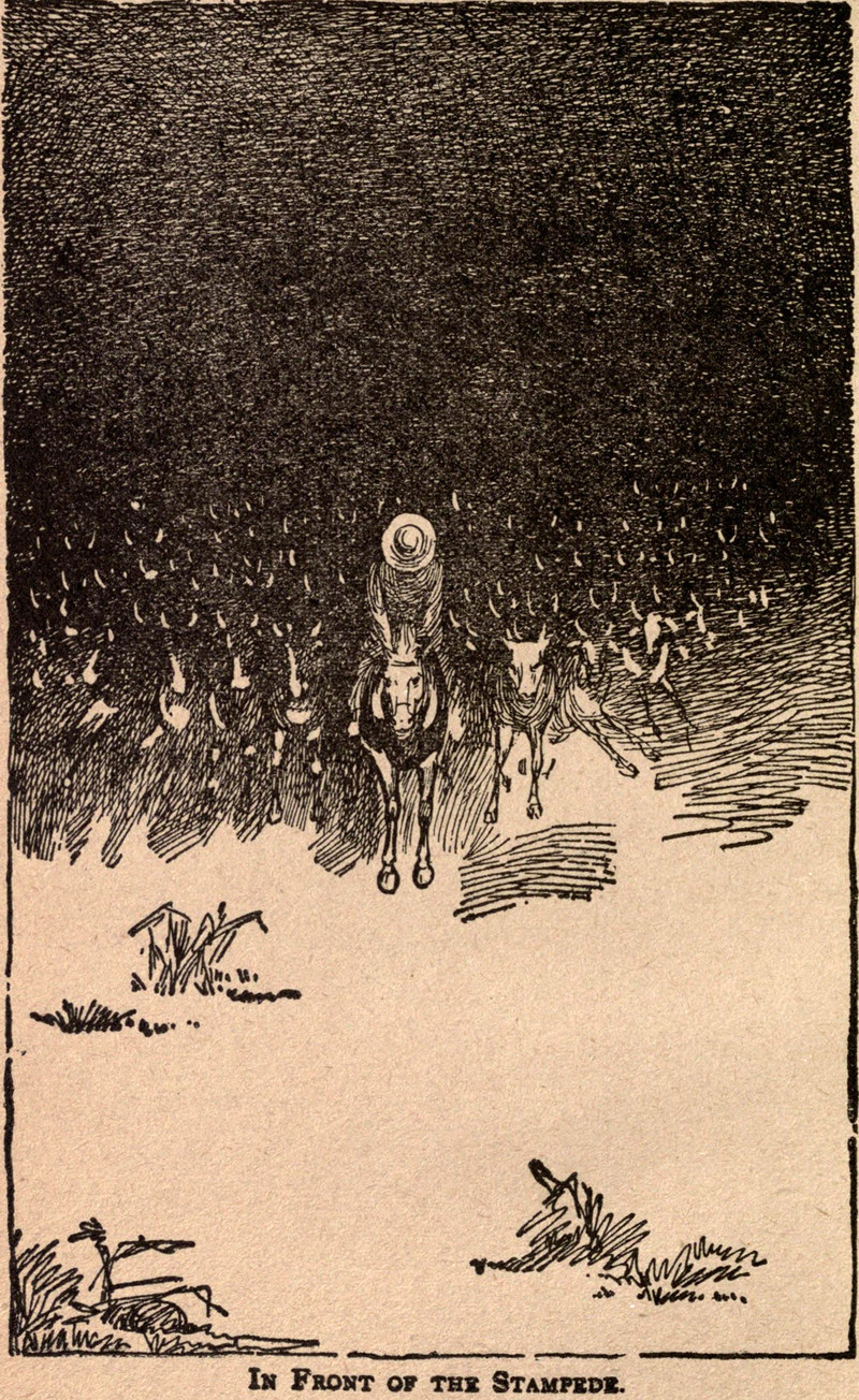 "In front of the stampede."  From Ten Years a Cowboy by Charles Clement Post, 1898.
