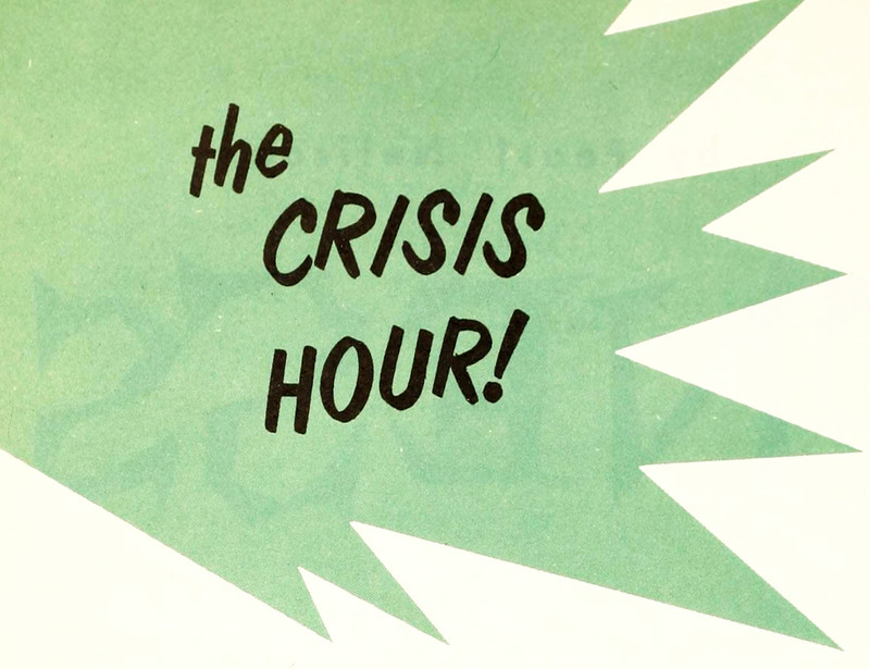 It may, indeed, feel like the crisis hour, but keep in mind that elves are tampering with the clock ten times a day, as we discovered here.  From Lighted Pathway, 1958.
