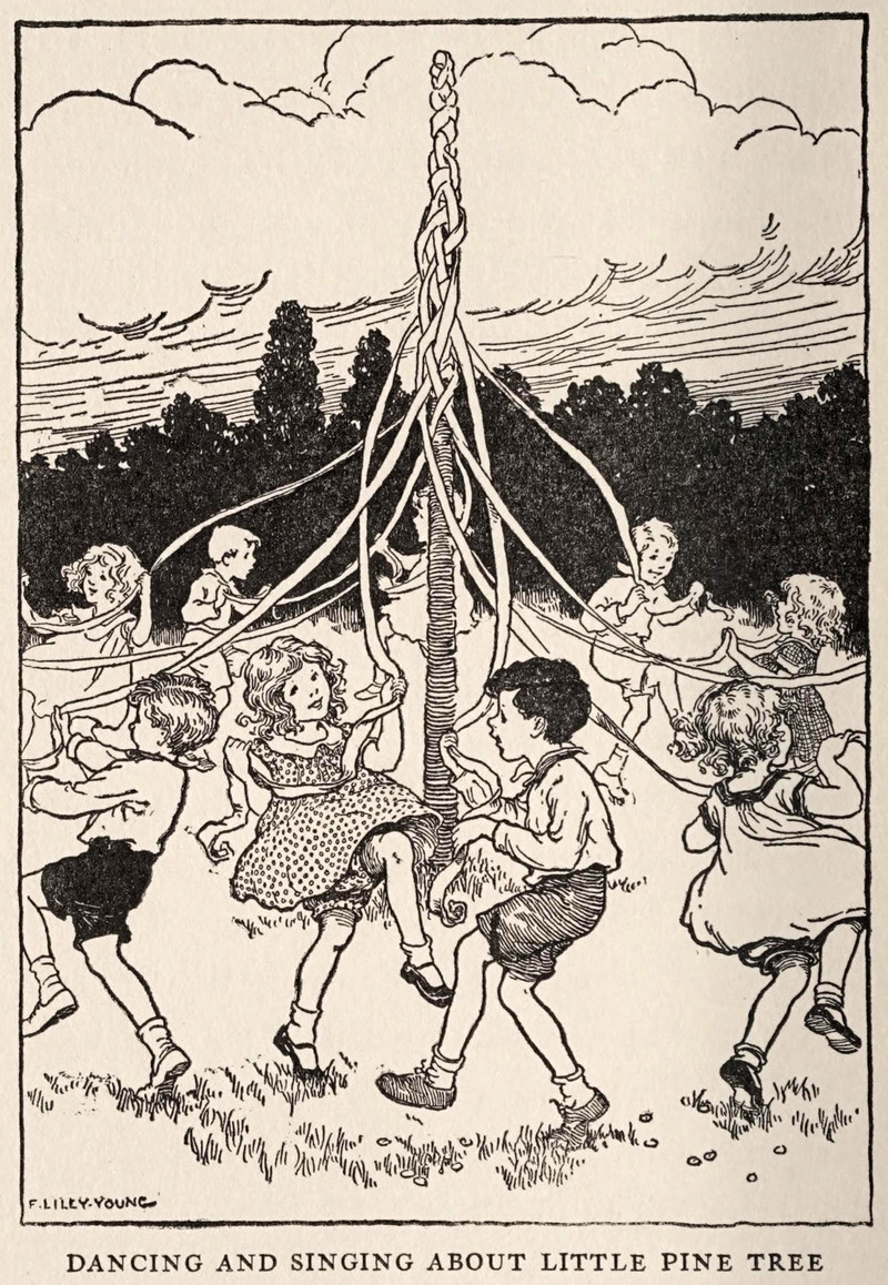 With the proliferation of video games, who now dances the Maypole in honor of the little pine tree? It's a question few are asking. From Old Town Clock by Reba Mahan Stevens and illustrated by Florence Liley Young, 1931.