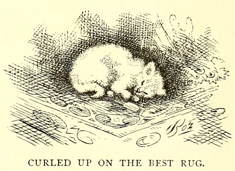 "Curled up on the best rug."  From The Cats' Arabian Nights by Abby Morton Diaz, 1881.