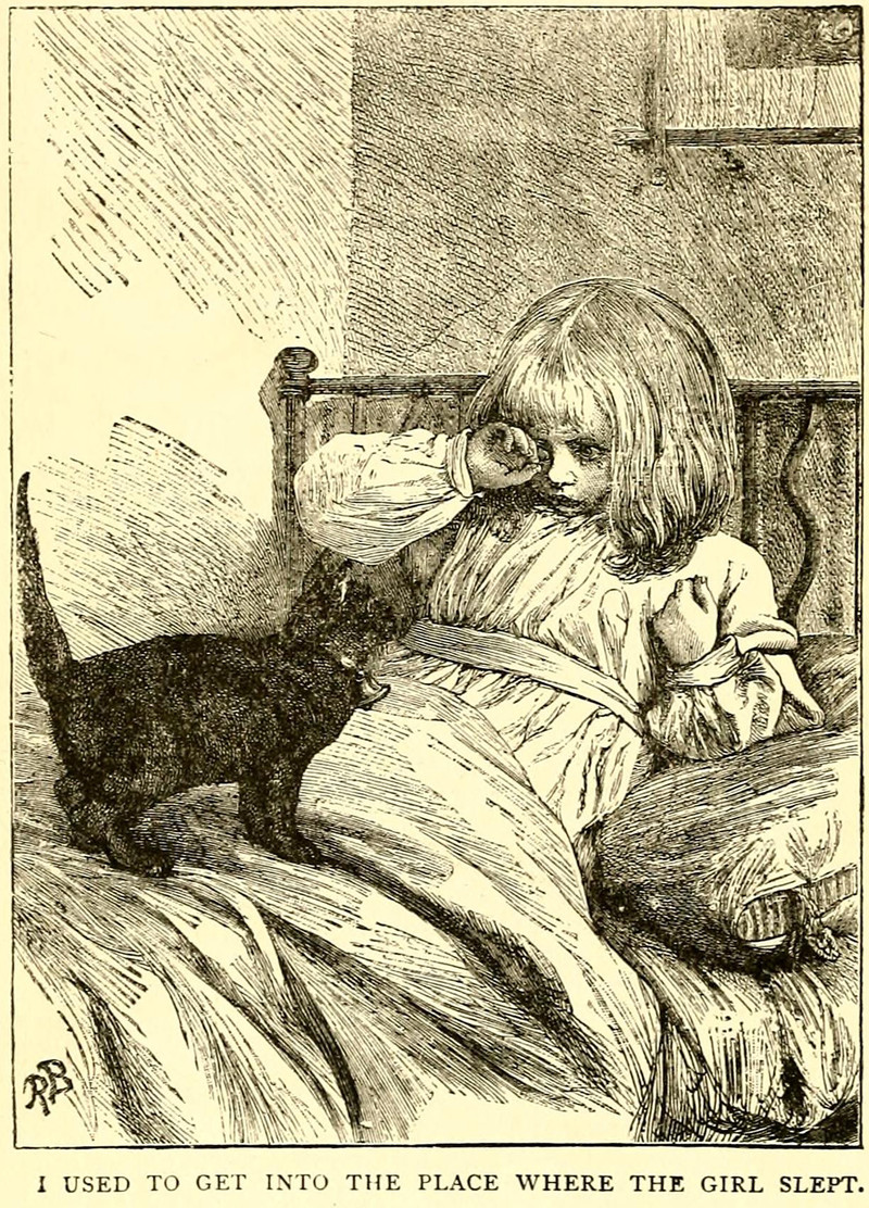 The cat who "used to get into the place where the girl slept."  From The Cats' Arabian Nights by Abby Morton Diaz, 1881.