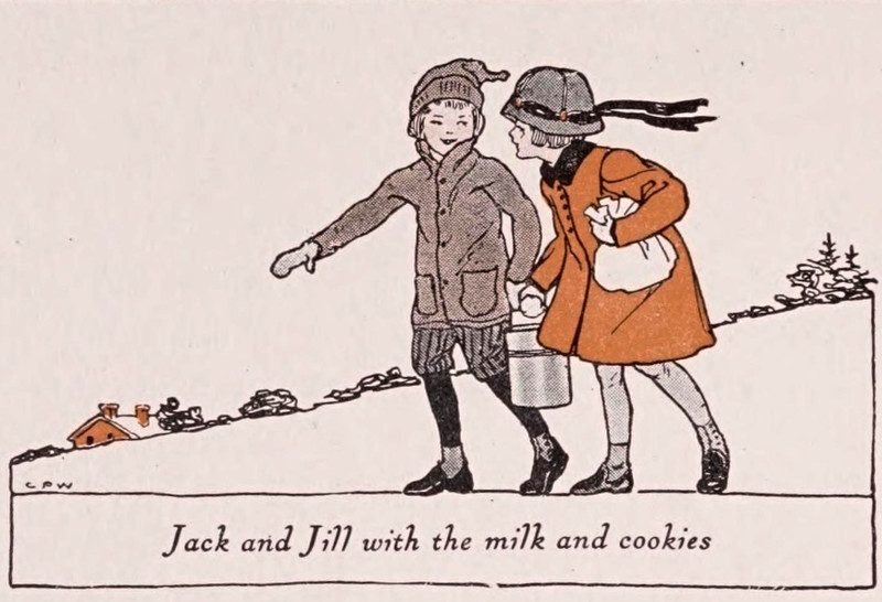 You may have heard that Jack and Jill went up the hill to fetch a pail of water, but it was actually milk and cookies. From The Pixie in the House by Laura Rountree Smith and illustrated by Clara Powers Wilson, 1915.
