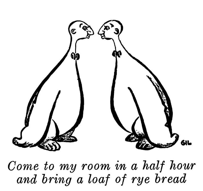 "Come to my room in a half hour and bring a loaf of rye bread."  From Purple Parrot, 1942.