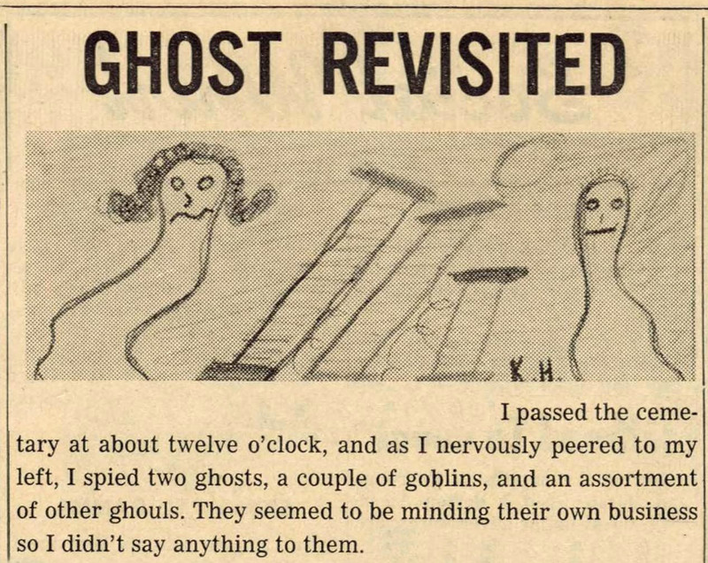 Two ghosts, a couple of goblins, and an assortment of other ghouls were minding their own business at the cemetery about midnight. From Current Sauce, 1963.