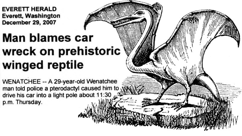 "Man blame car wreck on prehistoric winged reptile."  Via UFO Newsclipping Service, 2008.