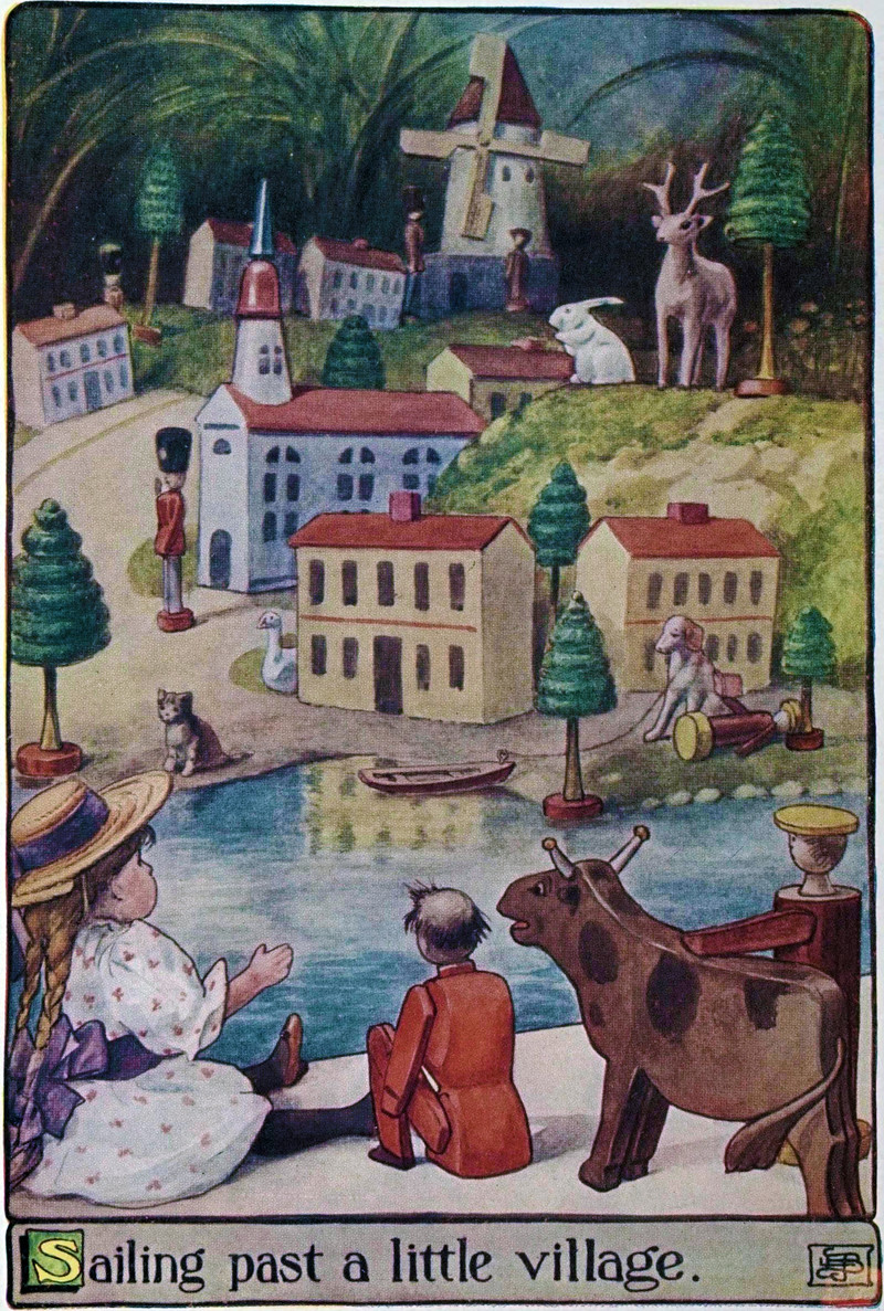 A precursor to Disneyland's Storybookland canal ride past little villages.  From The Voyage of the Wishbone Boat by Alice C. D. Riley, 1906.