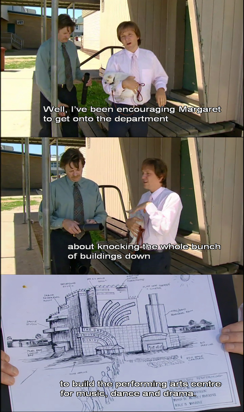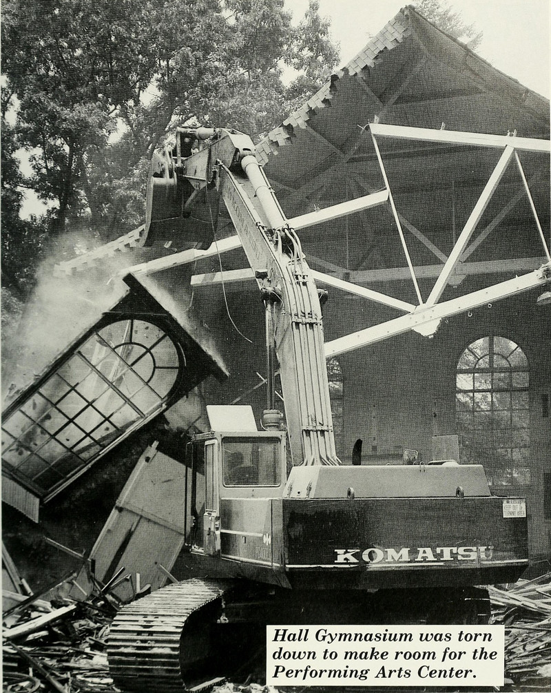 A gym being torn down to make room for a performing arts center? It's a precursor to the Australian comedy series Summer Heights High. From Swarthmore College's 1989 yearbook.