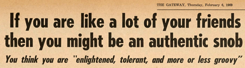 "If you are like a lot of your friends then you might be an authentic snob. You think you are 'enlightened, tolerant, and more or less groovy.'" From The Gateway, 1969.