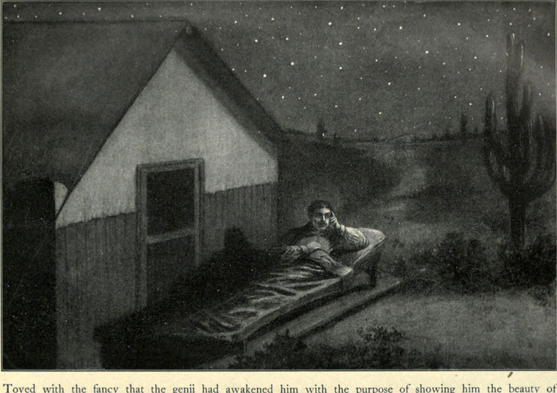 "He sometimes toyed with the fancy that the genii had awakened him with the express purpose of showing him the beauty of the desert night, a beauty baffling description, and which alone, it seemed to him, was worth the journey hither." From This Labyrinthine Life, A Tale of the Arizona Desert by George Alexander Fischer, 1907.