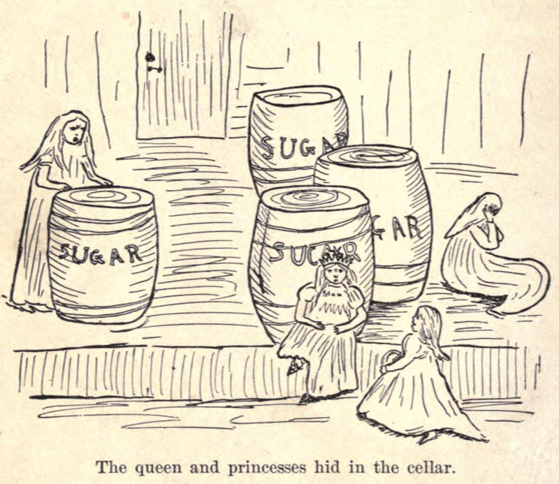 In The Lion in Winter, the queen is locked in the cellar with her three princes.  Here, "The queen and [three] princesses hid in the cellar."  From The Book of Knight and Barbara by David Starr Jordan, 1899.