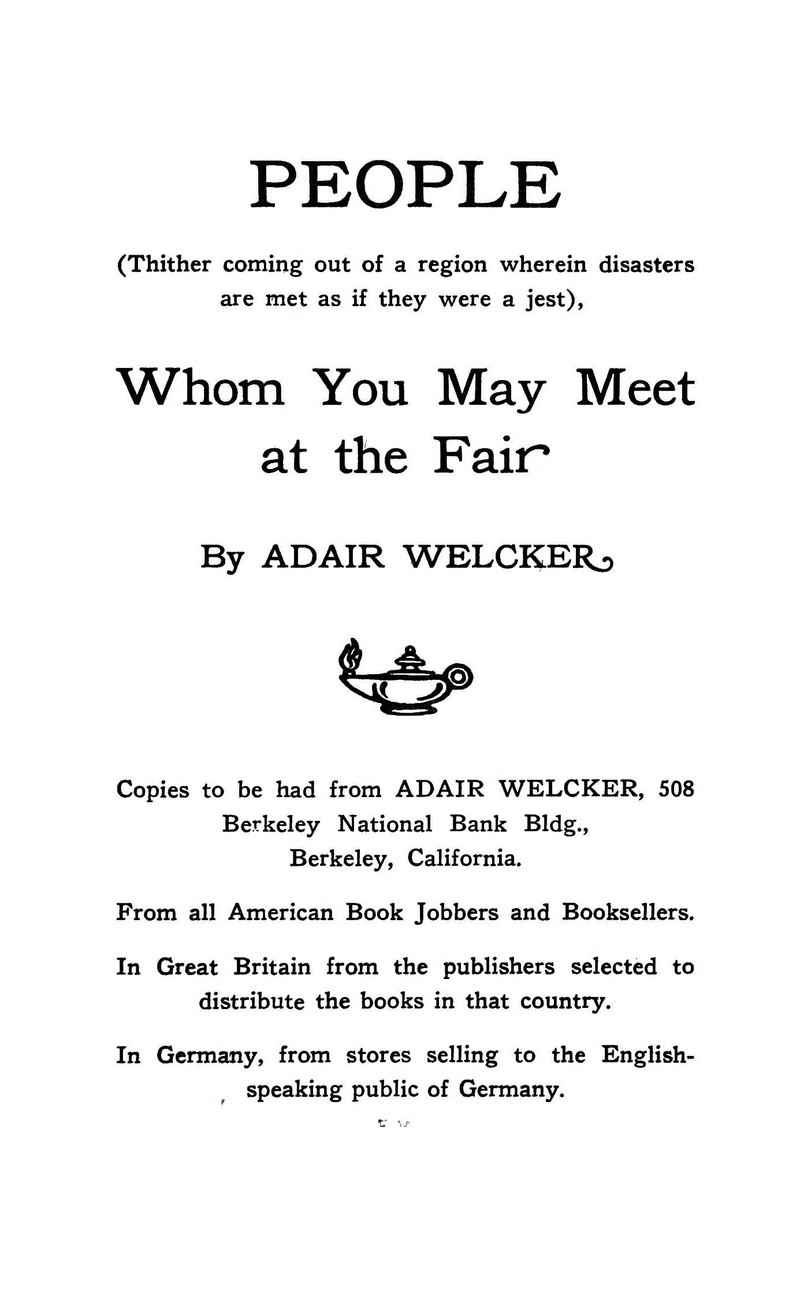 Just in case you're collecting book titles containing tiny parenthetical phrases, here is People (Thither coming out of a region wherein disasters are met as if they were a jest), Whom You May Meet at the Fair by Adair Welcker, 1913.