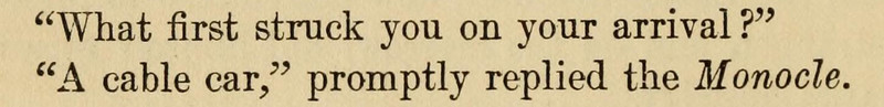 Lots of fun anthropomorphized monocle business here, including a glass wafer nearly slipping on a banana peel, and a patch of crystal giving austere glances and objecting to being bored. Also, don't miss the unusual word "zeroatic" to describe an ice-cold greeting. From