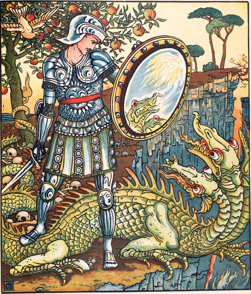 #vintage illustration #mirror #dragon #knight #shield #hydra #man headed