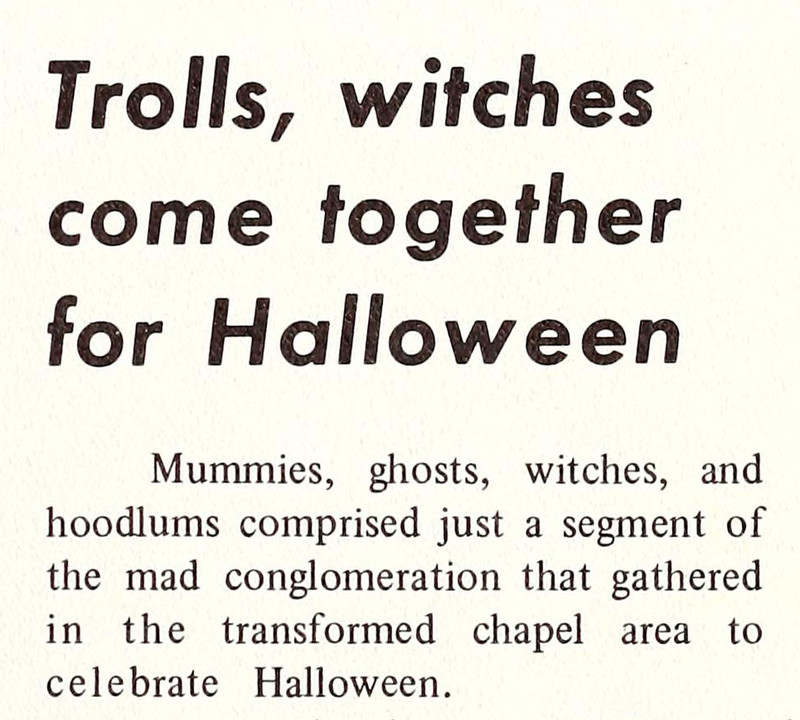 Gathered in a transformed chapel was a mad conglomeration of mummies, ghosts, witches, trolls, and hoodlums. From Michigan Christian College's 1973 yearbook.