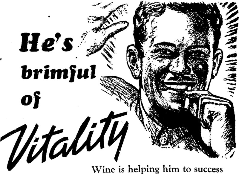 Good for him: "He's brimful of vitality.  Wine is helping him to success."  From The Bombay Chronicle, 1938.