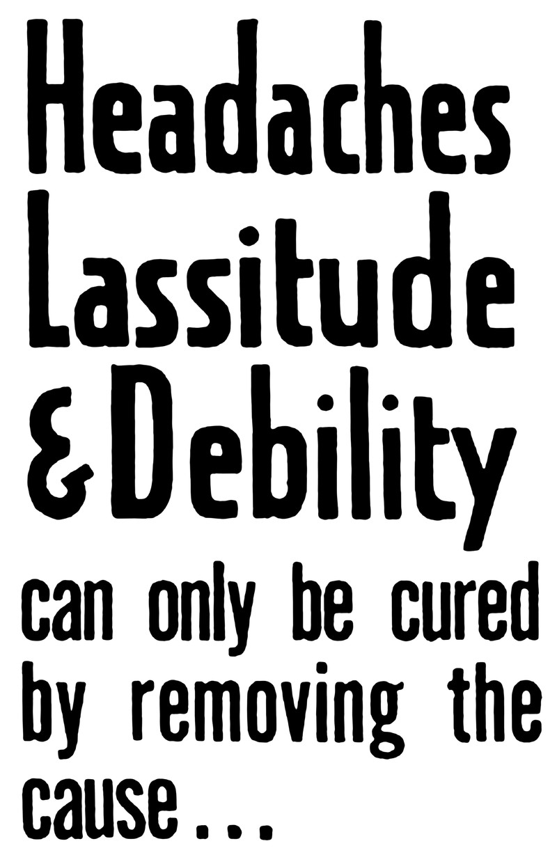 "Headaches, lassitude and debility can only be cured by removing the cause."  From The Bombay Chronicle, 1937.