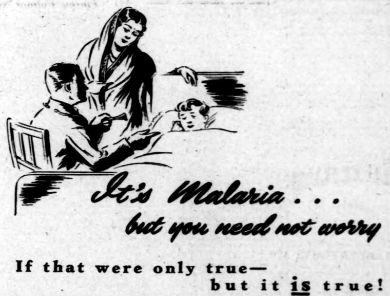 Great news: "It's malaria, but you need not worry.  If that were only true -- but it is true!"  From The Bombay Chronicle, 1947.