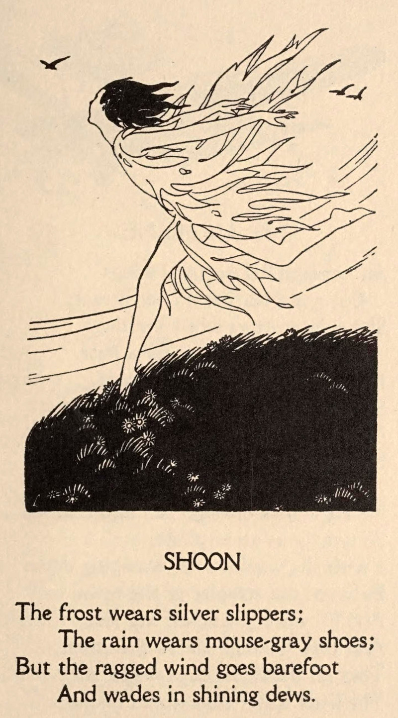 The wind goes barefoot.  From Around a Toadstool Table by Rowena Bennett, 1930.