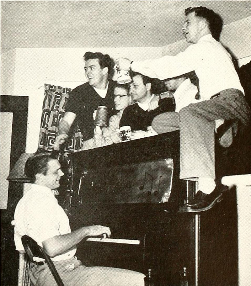 It's rarer to see folks atop upright pianos than atop grand pianos.  From Kent State's 1955 yearbook.