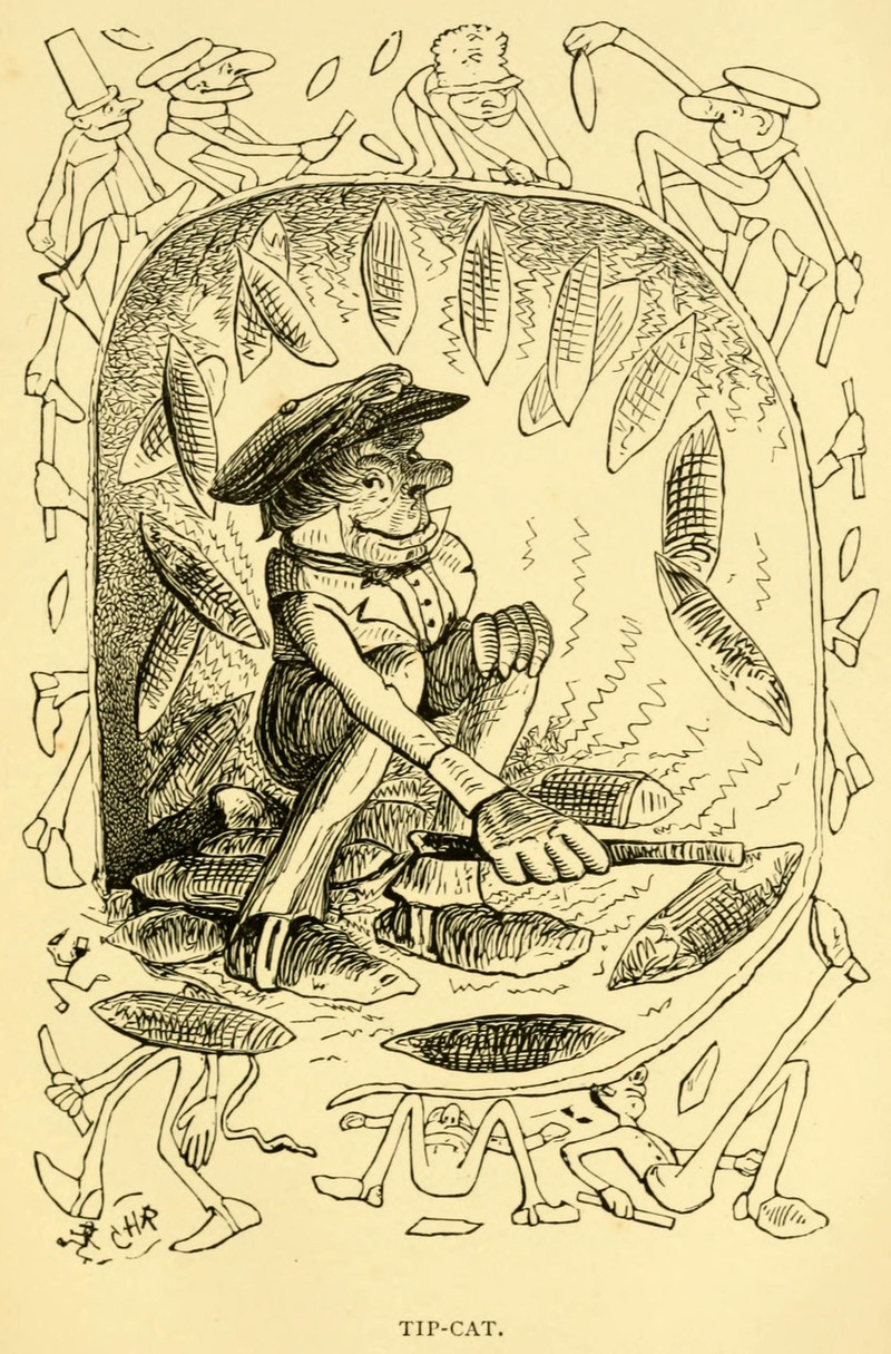 "Tip-cat" (the game involving a stick and a billet of wood).  From The Book of Cats by Charles Henry Ross, 1868.