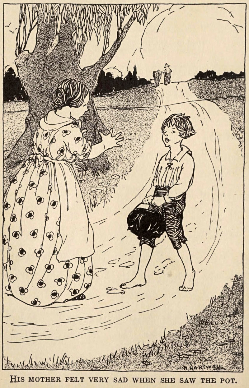 "His mother felt very sad when she saw the pot."  From Old Stories For Young Readers by Laura A. Large, 1916.