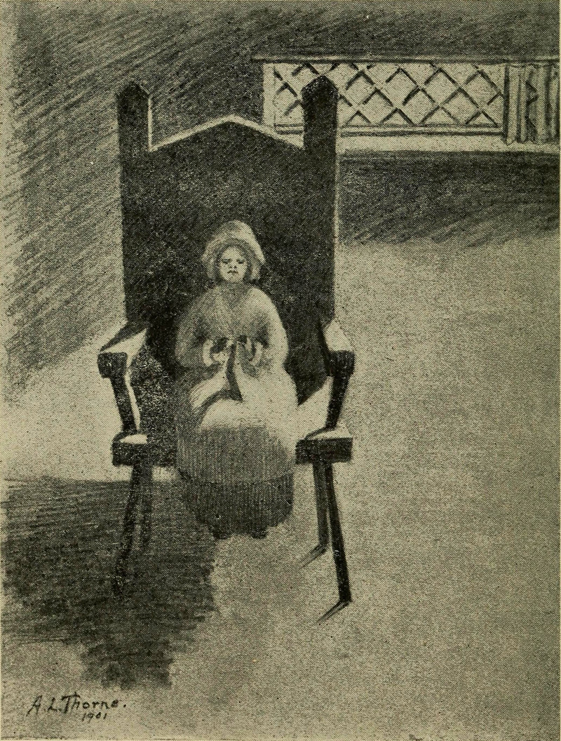 A (possibly cursed) living doll does some sewing. (The non-ergonomic chair is definitely cursed.) From Heart Songs by Gertrude Theresa Clark and illustrated by A. L. Thorne, 1901.