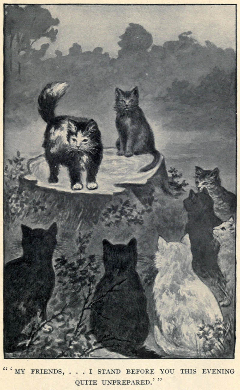"My friends ... I stand before you this evening quite unprepared."  From The Story of a Kitten and Her Friends by Marshall Saunders and illustrated by Diantha Horne Marlowe, 1913.