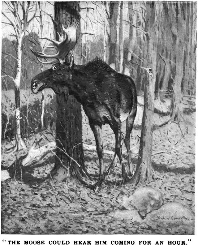 An illustration from an 1899 issue of Harper's magazine. The caption reads: "The moose could hear him coming for an hour."
