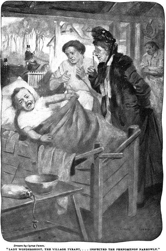 An illustration from a 1903 issue of Cosmopolitan magazine. The caption reads: "Lady Wondershoot, the village tyrant, inspected the phenomenon narrowly."