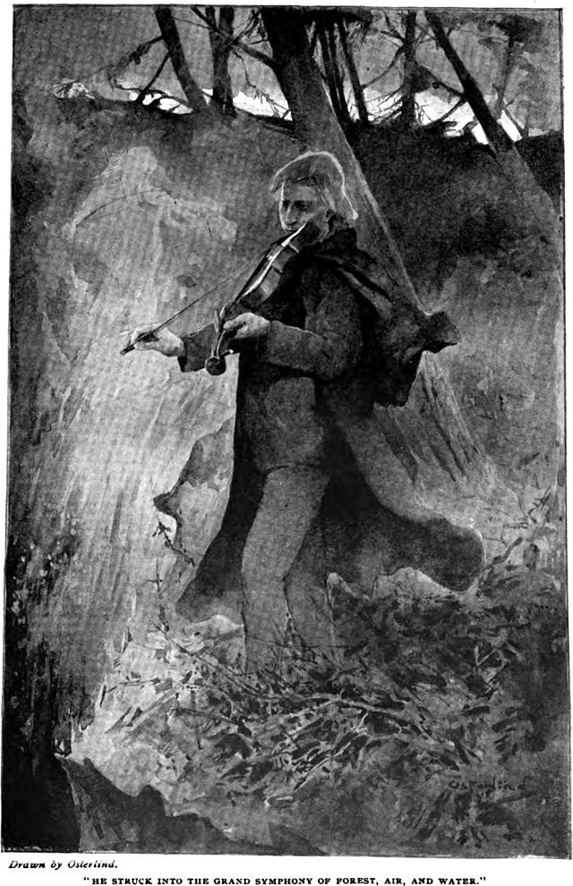 An illustration from an 1895 issue of Cosmopolitan magazine. The caption reads: "He struck into the grand symphony of forest, air, and water."