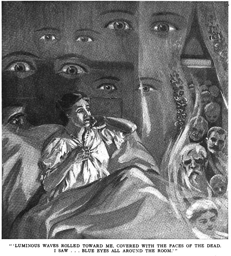 An illustration from a 1910 issue of Hampton's magazine.  The caption reads: "Luminous waves rolled toward me, covered with the faces of the dead.  I saw blue eyes all around the room."