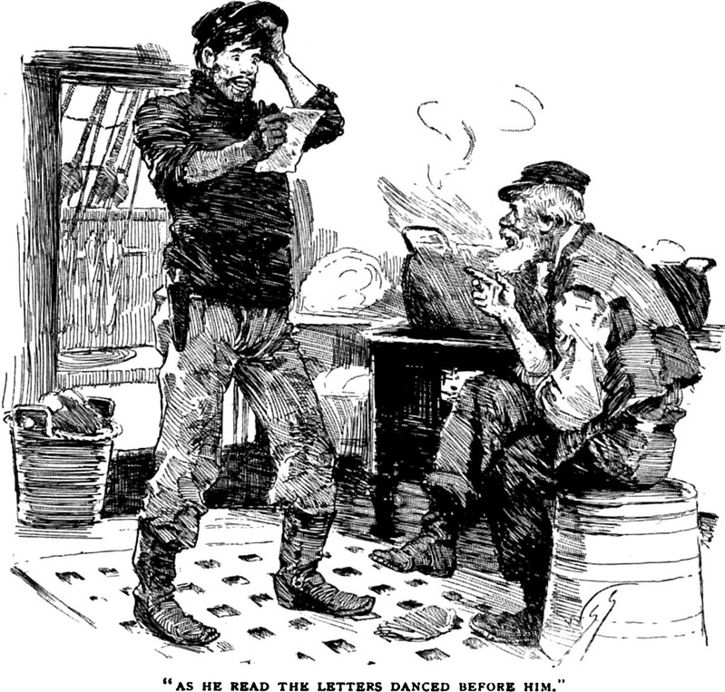 An illustration from an 1898 issue of The Strand magazine. The caption reads: "As he read the letters danced before him."